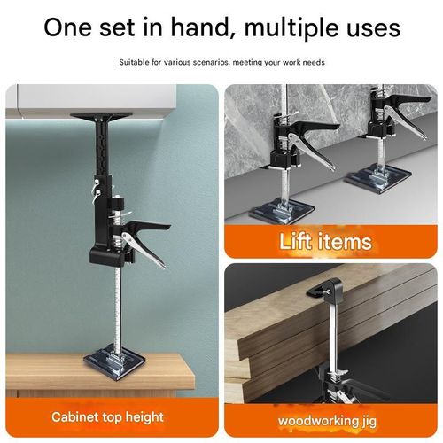Adjustable Cabinet Installation Jack – A manual lifting and positioning tool for overhead mounting of wall cabinets, doors, windows, and tiles.
